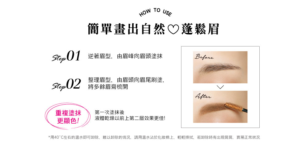 不易脱妆、防止一般汗水以及轻度摩擦,薄膜型配方,用温水清洗即可轻松卸除。